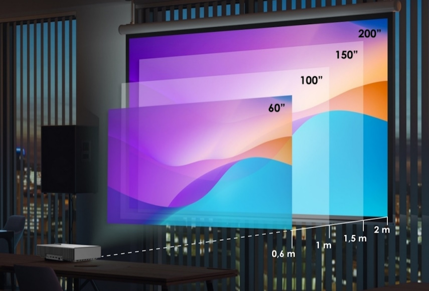 - Возможность проецирования на экран с диагональю 40-200 дюймов с дистанции от 0,45 до 2,1 метра.