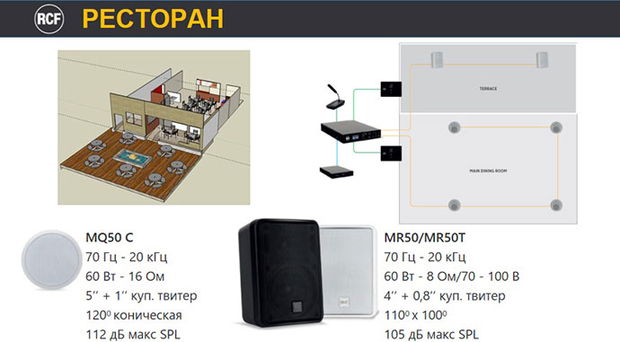 Для оборудования небольшого кафе или ресторана можно взять комплект из двухполосных акустических систем MQ50. Они поддерживают 16-омное подключение, что позволяет комбинировать четыре громкоговорителя на канал, если мы говорим про низкоомное подключение, а также 100-вольтовую и 70-вольтовую линии. Также мы часто применяем для таких инсталляций наши любимые обновленные версии моделей MR50, которые имеют нижний предел частотного диапазона 120 Гц, что позволяет без сабвуфера создавать более приятный фоновый звук, чем когда потолочные громкоговорители играют от 150 Гц, и вся музыка воспринимается как какое-то радио или патефон.