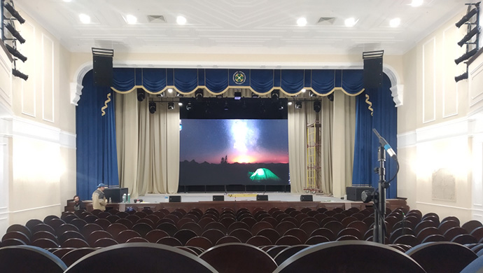 В качестве средства отображения видеоинформации на заднике сцены установлен светодиодный экран FantaLed P5 размером 3840 х 6720 мм и разрешением 1344 х 768 пикс. Для преобразования разрешения видео использован универсальный масштабатор RGBLink C1US Lite. Передача видеосигнала и сигнала управления от ПК до контроллера производится при помощи приемника и передатчика HDMI и USB по витой паре.
