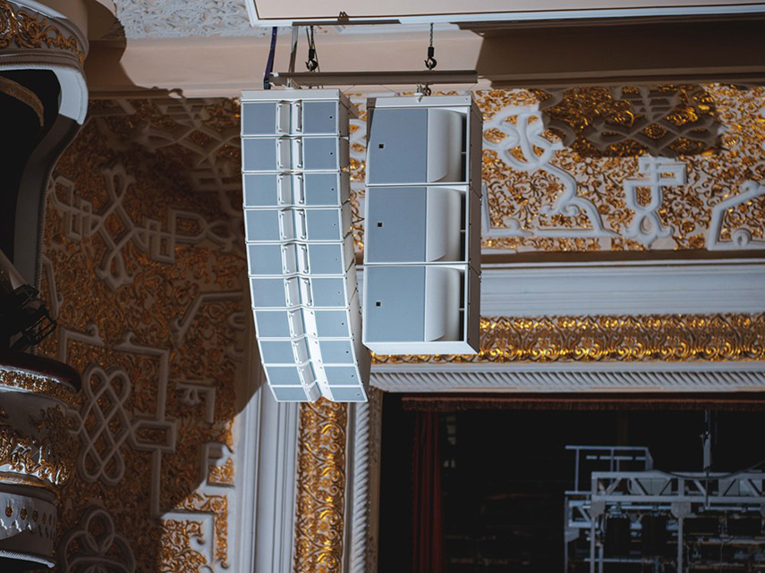 Основной портальной системы звукоусиления в главном зале стали две колонны линейных массивов L-Acoustics Kara IIi (по 10 элементов в кластере) и 6 низкочастотных элементов KS21i. Белое исполнение сабвуферов помогло гармонично дополнить архитектурную палитру помещения, не нарушив визуальную симметрию пространства. Для покрытия звуком ближнего поля, мониторинга и озвучивания подбалконных пространств задействовали коаксиальные громкоговорители 5XT, X15 HiQ и X8W (по 8 штук каждого).