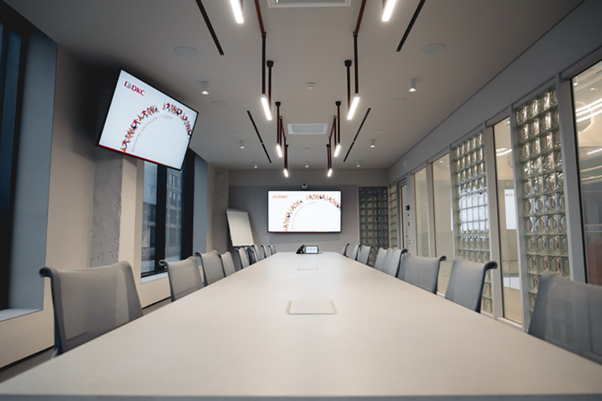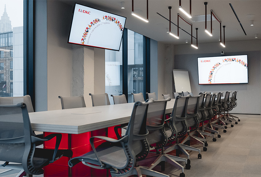 Компания IP Video Systems провела оснащение нового московского офиса АО «ДКС» — одного из лидеров в производстве кабеленесущих систем. От интегратора требовалось не просто установить оборудование, а создать под ключ единую, интуитивно понятную и отказоустойчивую мультимедийную среду. На этапе ремонтных работ нужно было спроектировать и интегрировать комплексные АВ- и ВКС-решения по всему объекту — от малых переговорных до многофункционального амфитеатра.