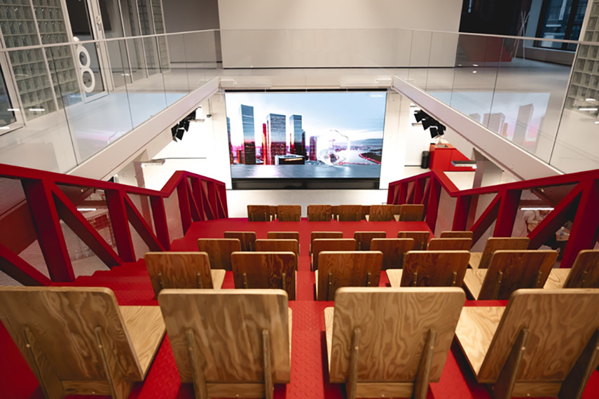 Центром притяжения нового офиса стал амфитеатр — место для корпоративных событий, обучения и презентаций. Его главным элементом является светодиодный экран «все в одном» Prestel LED-AIO216S, органично вписавшийся в архитектуру зала. Интерьерные акустические системы K-array, изначально размещенные по бокам средства отображения, после получения обратной связи от заказчика были оперативно перемещены в более подходящие точки пространства, а также дополнены корпусными громкоговорителями Monisms MNS-4A11OWS-1P с поддержкой протокола Dante.