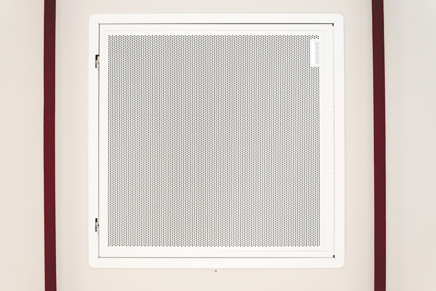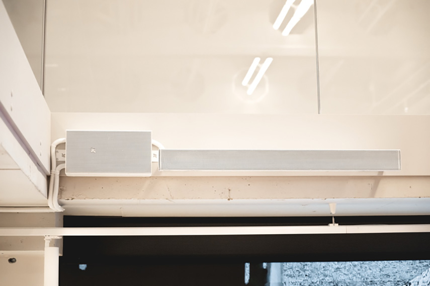 За равномерное звуковое покрытие помещения отвечают потолочные Dante-громкоговорители Monisms MNS-6A11CS-1P, у каждого из которых можно независимо управлять громкостью, эквализацией и другими параметрами. Выводить различные источники на несколько дисплеев и бесшевно переключаться между ними позволяет система распределения сигналов на базе матричного коммутатора Prestel FMS-44H2A.