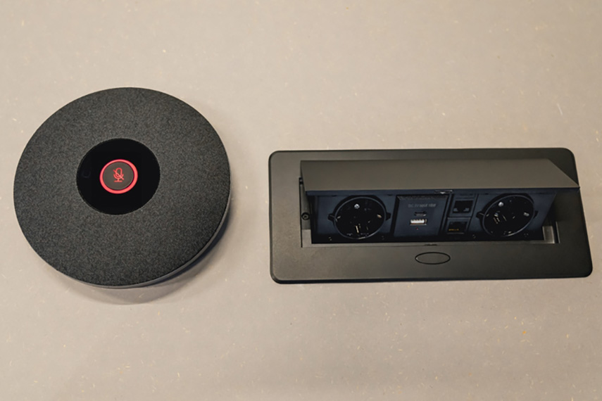 В малых (4–6 чел.) и средних (6–8 чел.) требовалось обеспечить простое подключение личных устройств (BYOD) и стабильное качество связи, избавившись от потенциальной проблемы с необходимостью зарядки беспроводных спикерфонов. В оснащенных помещениях пользователи могут подключать персональные ноутбуки через архитектурные лючки одним из двух способов: через USB + HDMI или USB-C. Камера, микрофоны и дисплей распознают подключение, после чего система без дополнительных настроек готова к работе.