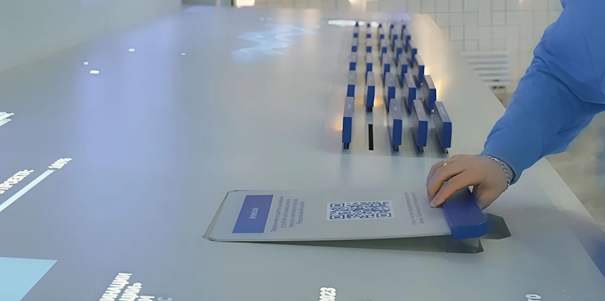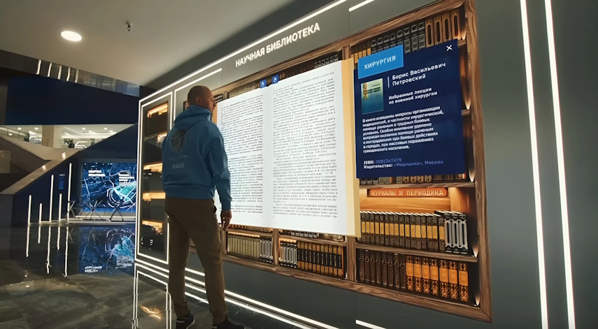 Еще практичнее этот процесс организован в инсталляциях «Возможности профессиональной реализации» и «Научная библиотека», где задействованы интерактивные светодиодные экраны Absen ICON X136 с диагональю 136 дюймов. Они не только отображают необходимый контент, но и снабжены инфракрасной рамкой, позволяющей им управлять. Например, в «Научной библиотеке» с их помощью было реализовано перелистывание страниц книг, находящейся в виртуальном книжном шкафу. По QR-коду слева можно получить доступ к библиотеке на смартфоне и продолжить чтение в другое время.