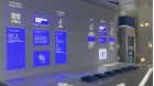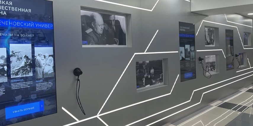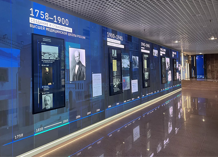 Знакомство с историей университета начинается сразу у входа в конгресс-центр, где на стенах галереи, окружающей конференц-залы, размещены экраны различного размера. Повествование в инсталляции организовано в виде временной ленты, отражающей ключевые этапы развития, а сама она реализована путем интеграции интерактивных дисплеев Lumien в светодиодное полотно с синхронным выводом контента всеми средствами отображения.