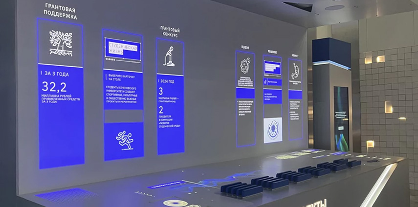 Фиджитал-интерактив присутствует в инсталляции «Молодежные проекты», позволяющей посетителям узнать о поддержке инициатив студентов. Для выбора интересующей темы нужно переместить табличку с ее названием на считыватель, после чего требуемая информация будет показана над рабочей поверхностью. Основой этой инсталляции стала проекция. Для засвечивания стены здесь применяются две УКФ-модели Optoma ZU500USTe, а для вывода инфографики на поверхности рабочего стола ─ две инсталляционные модели c проекционным отношением 0,65:1 - 0,75:1.