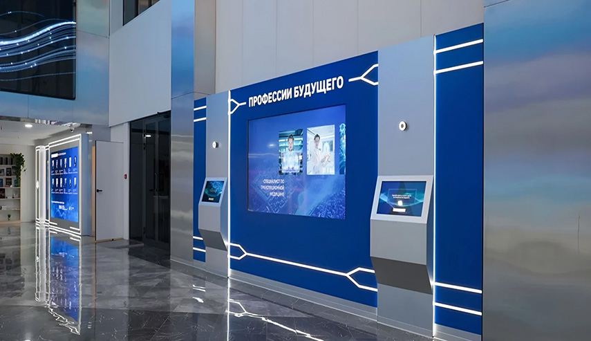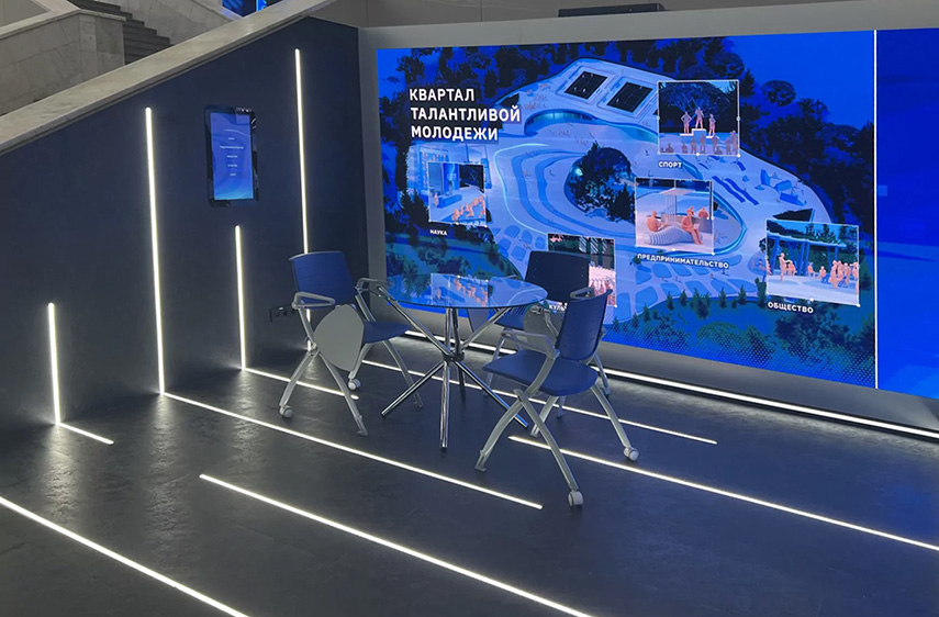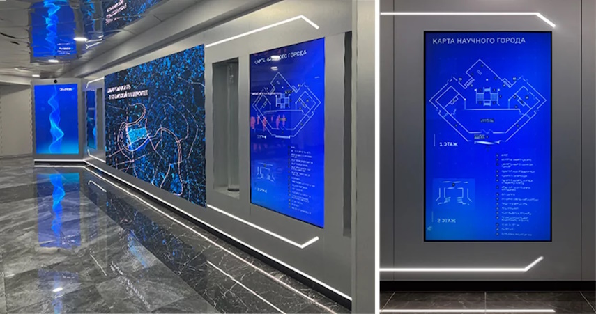 Для удобства ориентации участников проводимых здесь конференций на встраиваемых дисплеях Lumien и профессиональных панелях серии Standard демонстрируется карта научного города. Познакомиться с программой, докладчиками и темами можно на двух инфоколоннах, организованных на базе 98-дюймовых дисплеев Lumien LS9850SD, которые установлены в портретном режиме. Размер экрана, достигающий 2,2 метра в высоту, и широкий угол обзора, составляющий 178 градусов, обеспечивают оптимальное восприятие информации. На ресепшен используется 110-дюймовый дисплей Lumien LS11050SD. Он имеет размеры 2,4 x 1,4 метра и способен выводить изображение с разрешением 4K@60.