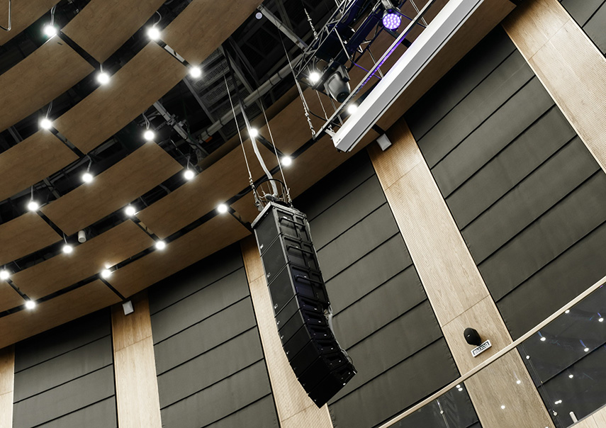 Аудиосистема включает в себя локальное звукоусиление для каждой зоны, беспроводные и конгресс-микрофоны с автонаведением камер на говорящего, системы синхронного перевода, решение для поддержки слабослышащих участников и отдельные линейные выходы для работы СМИ.