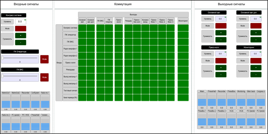 Для гибкого управления аудиосигналами в проекте задействован модульный процессор Xilica Solaro FR1 с платами Dante и USB. Он отвечает за маршрутизацию и обработку звука, позволяя выполнять эквализацию, вносить задержки, подавлять эхо и обратную связь от микрофонов. Возможность управления всеми параметрами звука с одного экрана реализована с помощью индивидуальной графической оболочки, созданной в ПО Xilica Designer. Оперативный выбор источников и регулировка громкости без участия основного оператора производятся через настенные панели в пресс-холле. Настройки и мониторинг всех цифровых блоков системы осуществляется по локальной сети.