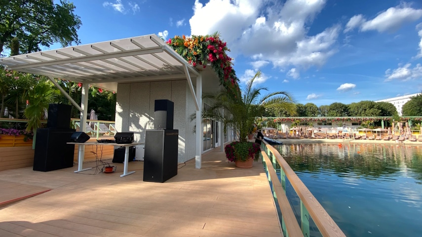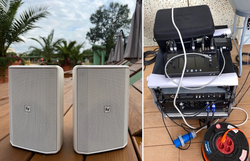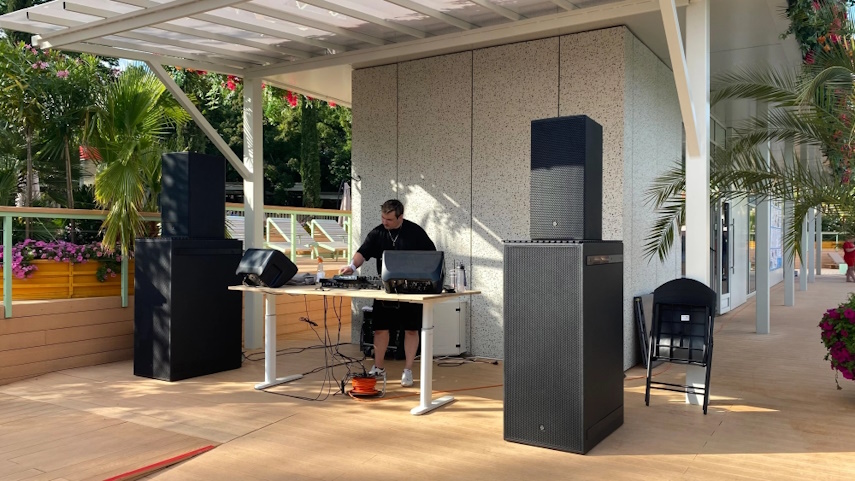 Рабочее место диджея оснащено акустическими системами EM Acoustics R12 и сабвуферами S-218, активными мониторами Yamaha DBR10 и цифровым микшерным пультом Allen & Heath CQ-18T. Все оборудование, установленное на открытом воздухе, размещено в специальных боксах с классом защиты IP65.