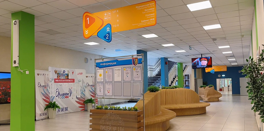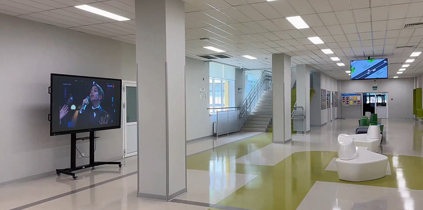 Для информирования и создания современной атмосферы в рекреациях была развернута система школьного телевидения. Ее основу составили профессиональные 55-дюймовые ЖК-панели с медиаплеерами HD224, позволяющими осуществлять централизованное удаленное управление транслируемым контентом (расписание, новости, объявления). В одной из рекреаций организован комплекс кинозал. Для демонстрации контента в нем предусмотрен яркий проектор с разрешением Full HD и качественная система звукоусиления. В зоне библиотеки был реализован мобильный медиацентр с интерактивной панелью на стойке. Спортзал получил профессиональную 55-дюймовую панель на мобильной стойке для показа учебных материалов и спортивных трансляций.