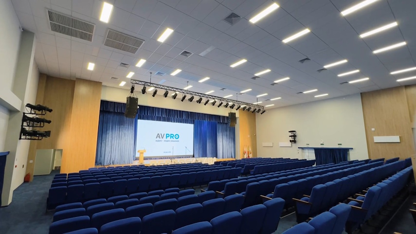 Это помещение стало технологическим сердцем школы, подготовленным для проведения мероприятий любого уровня. Наиболее сложной технической задачей в нем было создание профессионального многофункционального медиацентра. Видеоядром системы является светодиодный экран общей площадью 34 м² с шагом пикселя 4 мм и контроллером NovaStar, обеспечивающий яркое и четкое изображение.