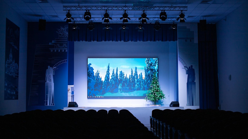 Актовый зал был трансформирован в многофункциональную сценическую площадку для творческих и торжественных мероприятий. Здесь можно проводить концерты, театральные постановки, фестивали и торжественные церемонии. Сформировать подходящую атмосферу и вовлекать зрителей помогают светодиодный экран, системы звукоусиления и постановочного освещения и интерактивная трибуна Aspirant. Дополняет оснащение помещения система хранения оборудования.