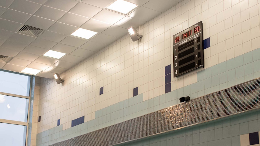 Дополнила все это установка настенных часов и электронного табло в бассейне, что помогает контролировать результаты во время соревнований и отработки нормативов.