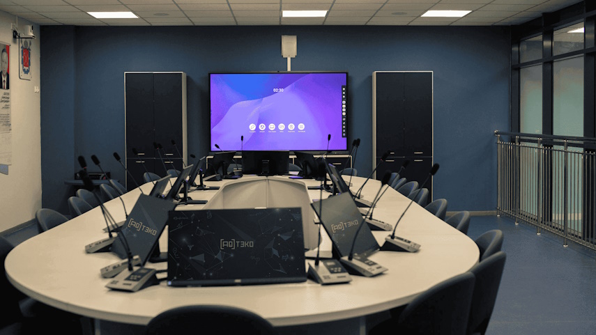 Конференц-зал колледжа укомплектован профессиональным комплексом для организации мероприятий различного формата — от учебных семинаров до международных конференций, что позволяет обеспечить высокое качество звука, изображения и видеосвязи, а также удобство для выступающих и операторов. В состав комплекса вошли: PTZ-камеры с ИИ-трекингом для автоматической съемки, беспроводная конференц-система с микрофонами, система отображения на базе интерактивной панели TeachTouch и 4K-дисплеев, напольные стойки-суфлеры, беспроводная система показа презентаций TrueConf Share, централизованная система управления ATEN и профессиональная операторская стойка с хранением оборудования.
