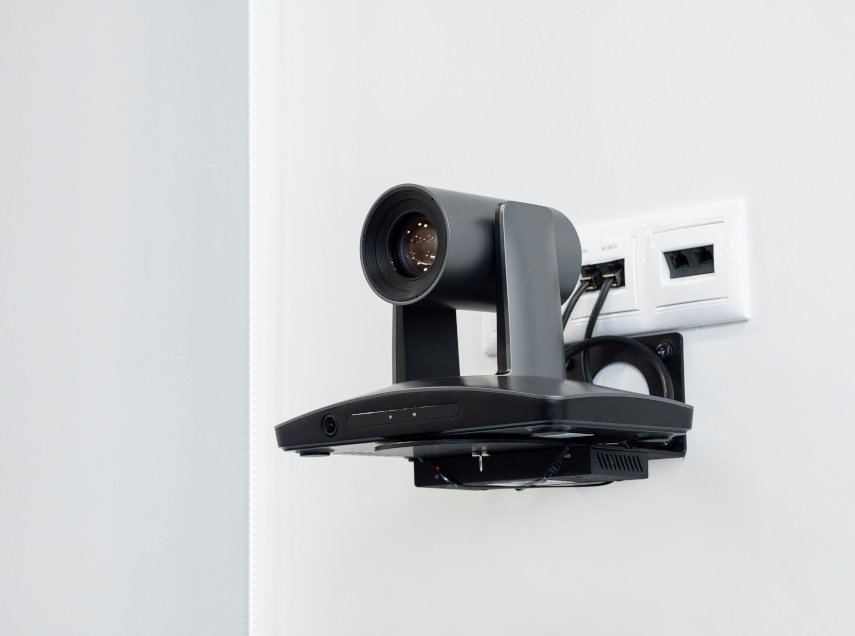 Для захвата видео в конференц-зале применены две камеры SmartCam А20L, установленные друг напротив друга. Первая их них расположена над видеостеной и направлена на участников конференции. Она может снимать общий план или в режиме лектора наводиться на говорящего человека, вне зависимости от того, где он расположился – за столом или у стены. Дополнительно настроен пресет наведения на генерального директора, который сидит с торца стола – напротив видеостены. Вторая камера направлена на саму видеостену. Она тоже дает общий план, но с другой стороны помещения.