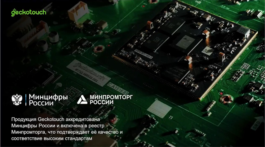 Отмечу, что компания Geckotouch — разработчик и производитель, включенный в реестр Минпромторга, не только финальных изделий, но и например материнской платы, которая содержится во многих наших продуктах. Такое решение позволяет нам предлагать конкурентоспособные цены на рынке и быть уверенными в высокой надежности и качестве своих товаров.