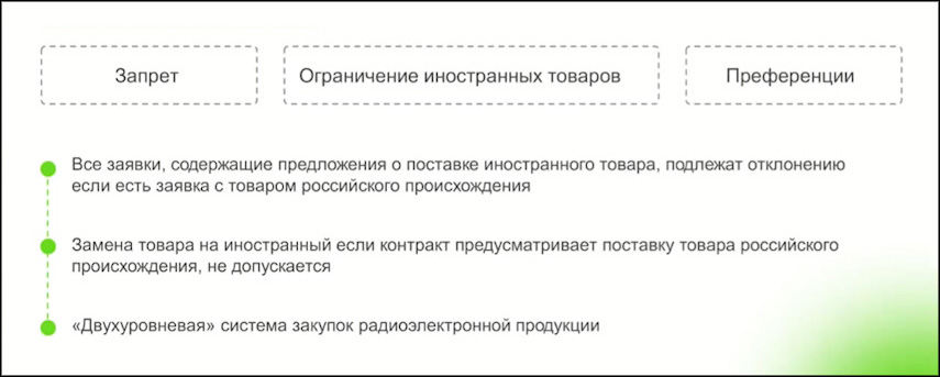На данный момент различные преференции и преимущества определяет Постановление Правительства РФ от от 23 декабря 2024 г. №1875 «О мерах по предоставлению национального режима при осуществлении закупок товаров, работ, услуг для обеспечения государственных и муниципальных нужд...». В зависимости от перечня, в которое попадает то или иное оборудование, оно предполагает запрет иностранных товаров их ограничение либо преференции.