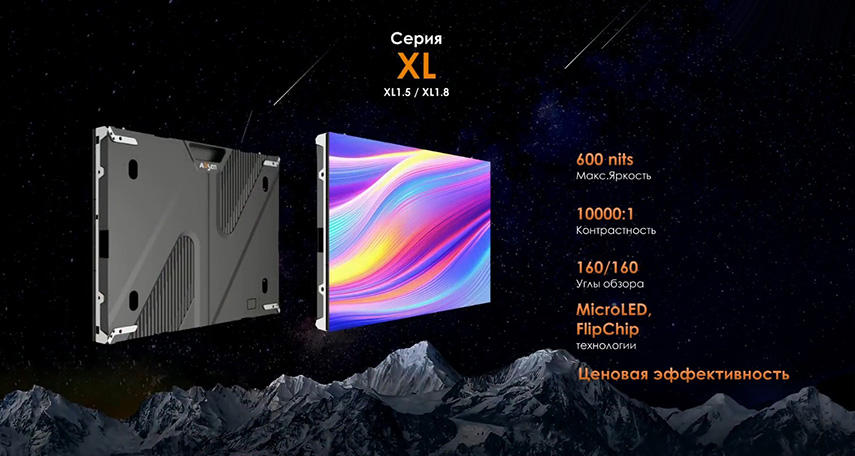 Компания Absen достаточно чутко чувствует тенденции рынка. Результатом этого стал выпуск серии XL. Это решение COB со стандартным набором технологий, включающим microLED и FlipChip. Оно имеет достаточно небольшой шаг пикселя — 1,5 или 1,8 мм, яркость 600 нит, контрастность 10 000:1 и углы обзора 160° х 160°, но когда партнеры узнают цену, они остаются приятно удивлены. Еще одним важным преимуществом этих экранов является то, что они находятся у нас на складе в Китае. Так что, если вам нужно универсальное решение с защищенной поверхностью и набором характеристик, которыми обладает технология COB, мы готовы его предложить.