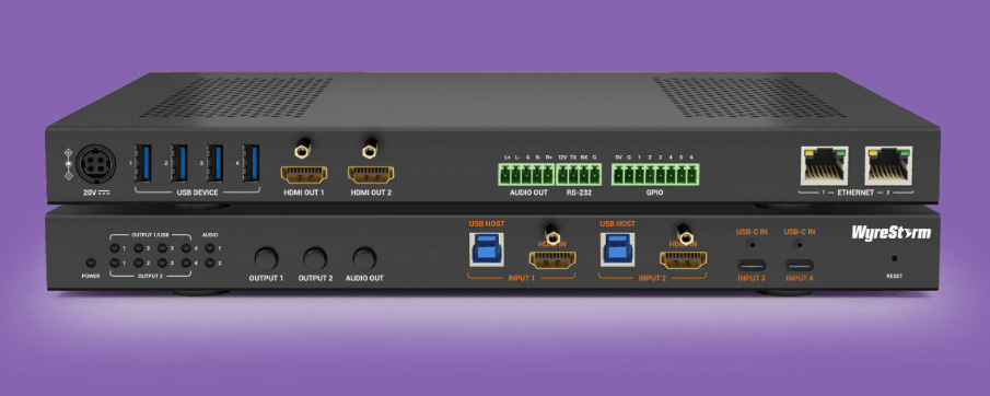 Еще одна новинка 2026 года представляет собой презентационный коммутатор с поддержкой функционала BYOM. Он получил один вход USB-C, один вход HDMI и два выхода HDMI, благодаря чему может отображать изображение как на одном, так и на двух экранах. Для беспроводного соединения предусмотрена совместимость с донглом APO-DG2-PRO, которая позволяет демонстрировать контент без необходимости подключения к сети Wi-Fi, а также технологиями AirPlay и Miracast. Кроме того, у модели есть возможность сопряжения с ноутбуком USB-периферии, как в проводном так и беспроводном режимах.