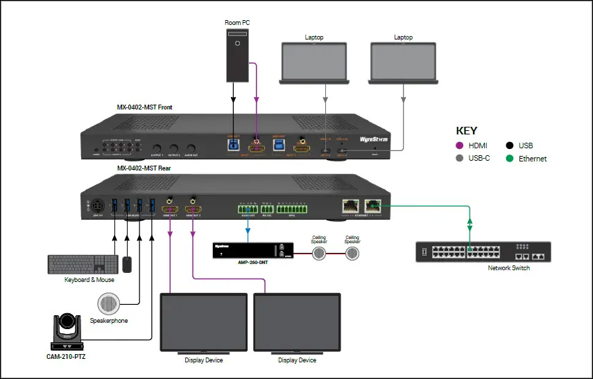 Эту задачу позволяет без проблем выполнять наш презентационный 4х2 коммутатор MX-0402-MST. У него есть 2 HDMI и 2 USB-C входа, один из которых совместим с технологией MST. Разрешение 4K@60 (4:4:4) поддерживается продуктом на всех входах и выходах. Коммутатор оснащен и дополнительными USB интерфейсами для функции KVM.