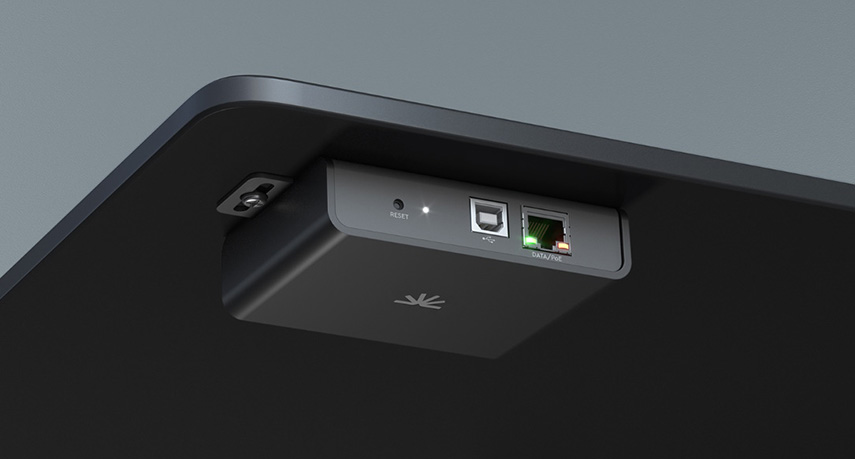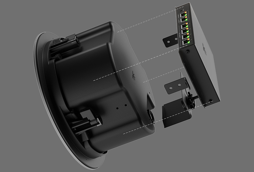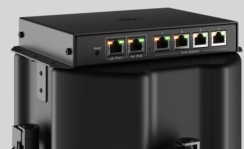 Усилитель бренда, как и его акустическая система, также сетевое устройство, которое при этом имеет возможности PoE-свитча. Он довольно компактный и крепится на корпус громкоговорителя. Для соединения с акустическими системами предусмотрены 4 выходные линии. К каждой из них можно подключить одно или два устройства. Таким образом, от одного усилителя может питаться от 4 до 8 громкоговорителей. Расстояние между ними способно достигать 100 метров. Сам усилитель питается по PoE+.