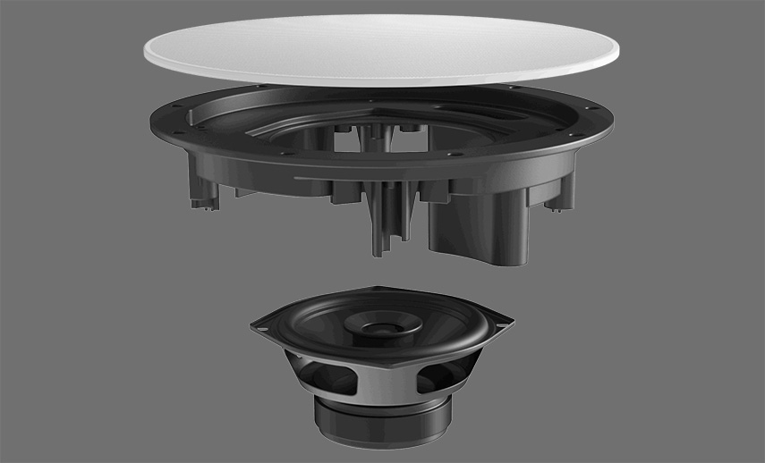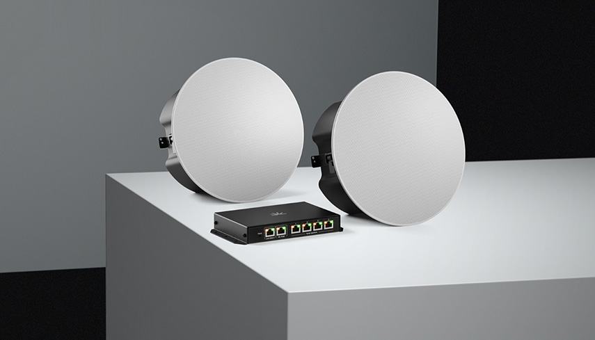 Это встраиваемая потолочная акустическая система с 5-дюймовым коаксиальным динамиком, выполненная в металлическом корпусе со съемным грилем и предназначенная для озвучивания конференц-залов и переговорных комнат. Интересна она в первую очередь тем, что является сетевой. То есть, в устройство по витой паре, подключаемой через RJ-45, приходит сигнал. Зачем это все нужно, если мы привыкли использовать обычные громкоговорители, подключаемые акустическим кабелем? Чтобы организовать единую, централизованно управляемую сетевую аудиосистему. Инженерно это может быть не очень привычно, но с практической точки зрения весьма удобно.