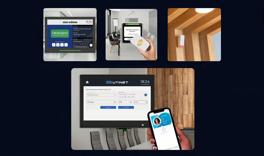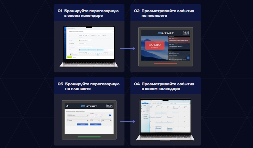 Бронирование можно выполнять как непосредственно с самого планшета, так и из корпоративного календаря. Все работает синхронно, поэтому, когда вы зарезервировали переговорную с планшета, оно будет отображаться также и в календаре, и наоборот — помещение, забронированное через календарь, можно просматривать на планшете. Доступна интеграция с календарями Exchange, Microsoft 365, Outlook, Microsoft Teams, Google Календарь, Яндекс Календарь, Bitrix24, VK Workspace и Mail. Сейчас у нас в активной доработке R7 Office (возможно, к началу второго квартала мы закончим). CommuniGate и 1C — опционально.
