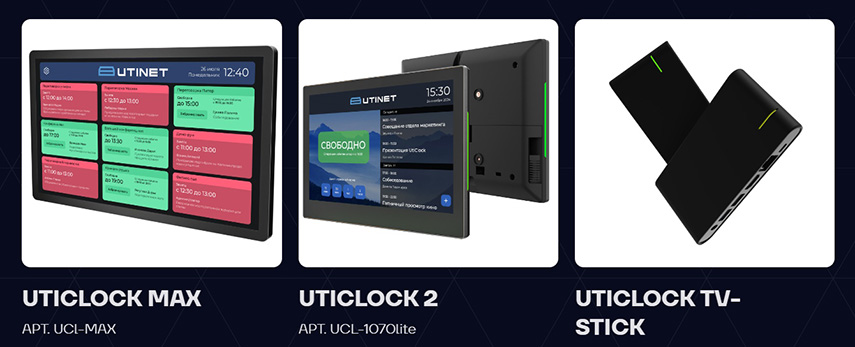 Основные модели — это UCL-1052, UCL-1060B, UCL-1070 и UCL-0360. Помимо них, есть панель с большой диагональю UCL-MAX, которая предназначена для вывода расписания всех переговорных комнат, панели на основе электронных чернил UCl-EP-0400 и UCl-EP-0700, а также снимаемая с производства UCL-0350. Дополняет ассортимент ТВ-приставка UCL-TV-STICK, позволяющая превратить любой дисплей в экран для вывода занятости помещений.