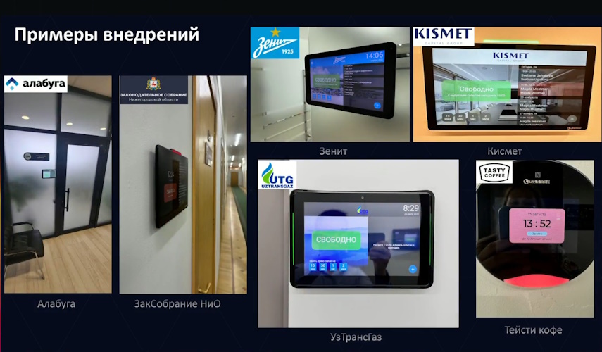 У нас достаточно много заказчиков по всей России, в том числе и крупных. Это ФК «Зенит», TASTY Coffee, «Алабуга», «Кисмет», ЗакСобрание НИО, «Работа России», Группа Родина, РУСС, Пулково и так далее. В СНГ мы оснащали, например, офис узбекистанской энергетической компании «Узтрансгаз». Из интересных кейсов можно отметить слияние систем бронирования и корпоративного телевидения на базе 24-дюймовых сенсорных планшетов для «Алабуга», модернизацию системы UtiClock под расписание раздевалок в спортивном комплексе «Юбилейный» в Санкт-Петербурге и внедрение кастомных панелей ePaper в петербургском лицее №369.