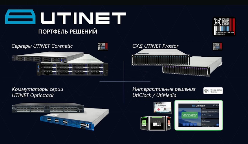 Ключевое оборудование — это реестровые серверы UTINET Corenetic (второе и третье поколения доступны сейчас, четвертое и пятое выйдет ближе к лету), коммутаторы серии UTINET Opticstack (планируется внесение в реестр в этом году), и системы хранения данных UTINET Prostor (две линейки — 6000 и 4000, также включенные в реестр), которые, грубо говоря, уровня ядра, но намного более бюджетные и с большим функционалом, за счет чего являтся весьма перспективным предложением на рынке. ПО для этого оборудования регулярно дорабатывается, потому что решения «тяжелые», и мы стараемся, чтобы все работало максимально эффективно. Помимо этого, в нашем ассортименте есть интерактивные решения — система бронирования UtiClock и система вывода медиаконтента по расписанию UtiMedia.