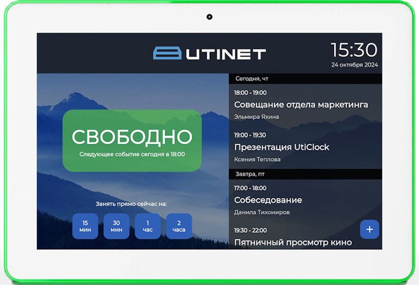 Это сенсорный планшет с предустановленным программным обеспечением и LED-подсветкой для наглядной демонстрации статуса помещения. В зависимости от модели она идет по всему периметру или только над экраном. Такое устройство устанавливается у входа в помещение и показывает свободно оно или занято. Помимо текущего статуса, на экране отображаются ближайшие события.