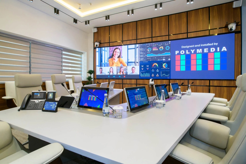 - Зал принятия решений: оснащен светодиодным экраном HC II 0.9 pro размером 4,8 х 1,35 метра с шагом пикселя 0,9 мм и разрешением 5120 х 1440 пикселей, что гарантирует высокую детализацию изображения для анализа критически важной информации.