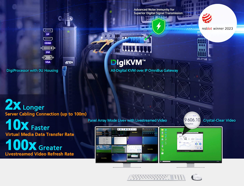 ATEN DigiKVM поддерживает до 32 серверных подключений и передачу видео с разрешением 4K на расстояние до 100 метров. Присутствуют кросс-платформенная совместимость и внеполосное управление (OOBM), обеспечивающее доступ к серверам даже при авариях сети.