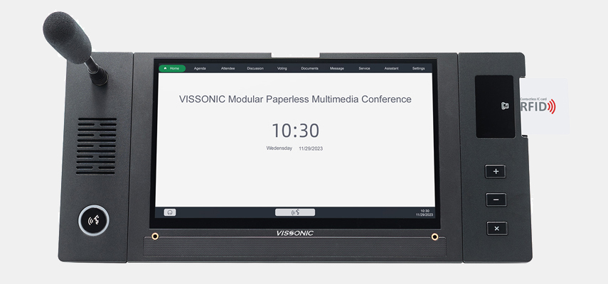 На предстоящих форумах AV FOCUS 2024 компания VISSONIC представит мультимедийную конференц-систему с терминалами, оснащенными сенсорными дисплеями с диагональю 11,6 и 15,6 дюймов. К ним подключаются модули с микрофоном, физическими кнопками голосования, идентификатор карт или громкоговоритель. Комбинация модулей и лицензий обеспечивает возможность настроить нужный для конференц-зала функционал.