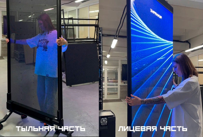 Устройство отличается низким энергопотреблением, малым весом и модульной архитектурой, что значительно упрощает монтаж, масштабирование и обслуживание. Конструкция поддерживает различные форматы установки — от витрин и стеклянных фасадов до внутренних перегородок и радиальных выставочных стендов. Возможность бесшовного соединения модулей позволяет формировать крупноформатные экраны практически любой формы и размера.