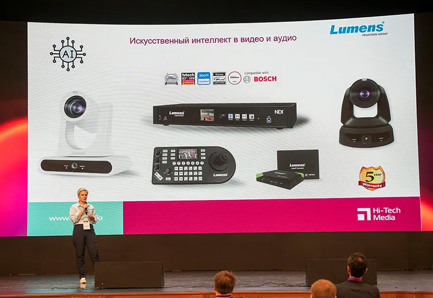 Важное место на стенде дистрибьютора займут АВ-системы на базе ИИ. Например, конференц-оборудование Gonsin 10000N, поддерживающее документооборот, перевод, управление голосом, регистрацию на конференции, аналитику и даже планирование задач — все под контролем искусственного интеллекта. В PTZ-камерах Lumens ИИ-технологии осуществляют автонаведение, отслеживание спикера, в том числе по голосу, и автопереключение между камерами. Функция VoiceConnect с помощью камеры VC-TR60A и декодера OIP-N60D создает многоракурсную съемку без необходимости привлечения съемочной группы. Решение «все в одном» Kandao Meeting Ultra на основе искусственного интеллекта отслеживает активного спикера и адаптирует частично обрезанное отображение участника.