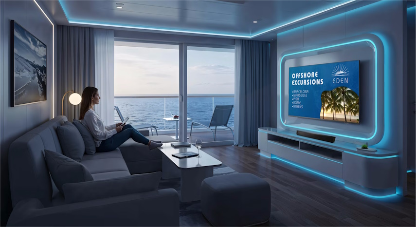 Ультратонкие модели серии 7000 для ограниченных пространств снабжены защитой от воздействия морского воздуха и допускают настройку подсветки в соответствии с дизайном номера.