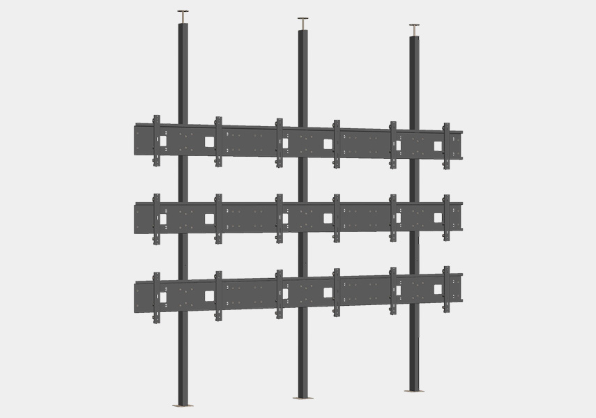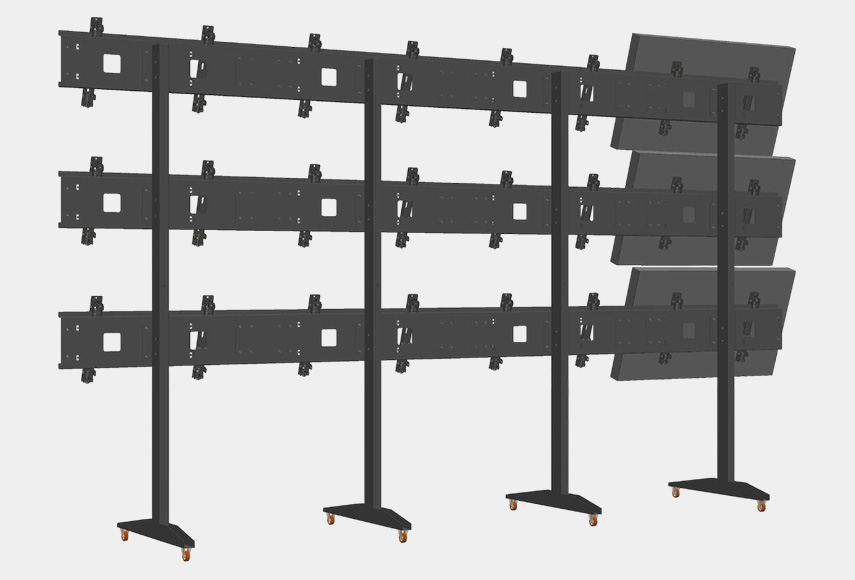 Ассортимент продукции бренда закрывает основные типы инсталляций. В его каталоге есть настенные конструкции для классических видеостен, потолочные системы для помещений со сложной архитектурой, напольные стойки и рамы для автономных установок, мобильные решения для временных пространств и распорные системы, применяемые там, где требуется особая устойчивость. Все модели оснащены системой 3D-регулировки, что позволяет сделать точную юстировку видеостены любой конфигурации.