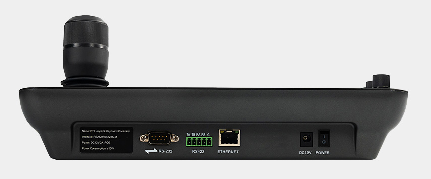 Из интерфейсов присутствуют: RS232 (вход), RS485, Type-C (UVC 1.1) и RJ45. Питание прибора может осуществляться от БП (12 В) или по PoE. Для удобства управления предусмотрены четыре энкодера, джог, 4D-джойстик, набор кнопок и 7-дюймовый дисплей высокой яркости с разрешением 1024 × 600 пикселей.
