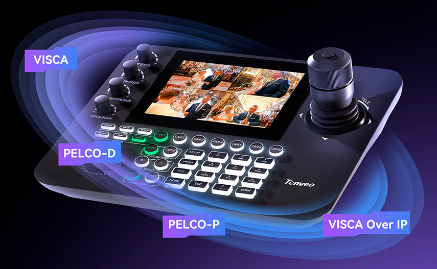 Tenveo KB300PRO — это профессиональный джойстик-контроллер, с помощью которого пользователи могут управлять из единого интерфейса большим количеством PTZ-камер. Новая модель поддерживает сопряжение до 254 устройств, протоколы VISCA over IP, NDI Control, Pelco-P, Pelco-D, Sony VISCA Compatible и ONVIF.