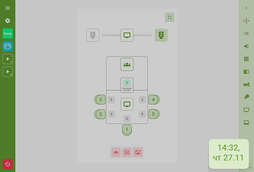 В версии 1.4 был обновлен главный экран. Теперь на нем отображаются текущая дата и время, что повышает удобство оперативного контроля и планирования. Помимо этого, добавилась возможность настройки дополнительных клавиш для прямого взаимодействия с оборудованием. Они позволяют в одно нажатие управлять ТВ-панелями, коммутацией, потолочными микрофонами, положением выдвижных мониторов и другими устройствами, а также запускать предустановленные сценарии.