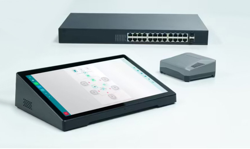 Центральным элементом комплекса является контроллер, выполняющий задачи сбора, обработки и передачи данных от остальных компонентов. Именно он получает сведения о состоянии подключенного оборудования и передает управляющие сигналы. Для взаимодействия с системой используется сенсорный планшет с предустановленным пользовательским интерфейсом. Он размещается на столе в переговорной комнате или в другом месте, где находится оператор.
